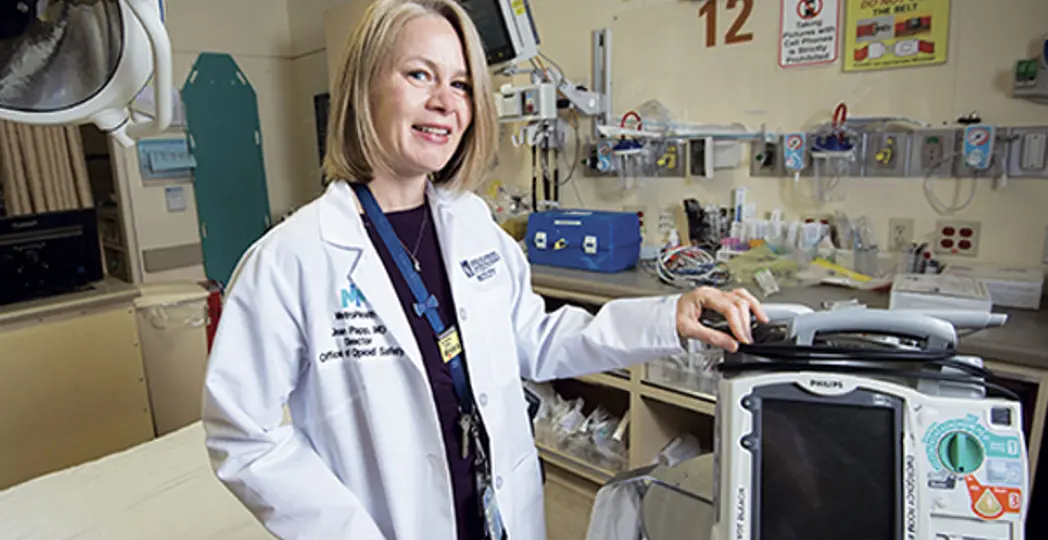 Dr. Joan Papp unzips a bright cobalt bag and begins taking out its contents. The medical director of MetroHealth Medical Center’s Office of Opioid Safety pulls out an airway mask to use while giving rescue breathing, a reference guide listing the signs of an opioid overdose, a brochure detailing resources for treating addiction and a plastic spray containing two 4-milligram doses of naloxone hydrochloride, better known by the brand-name Narcan — the lifesaving antidote for an opioid overdose.