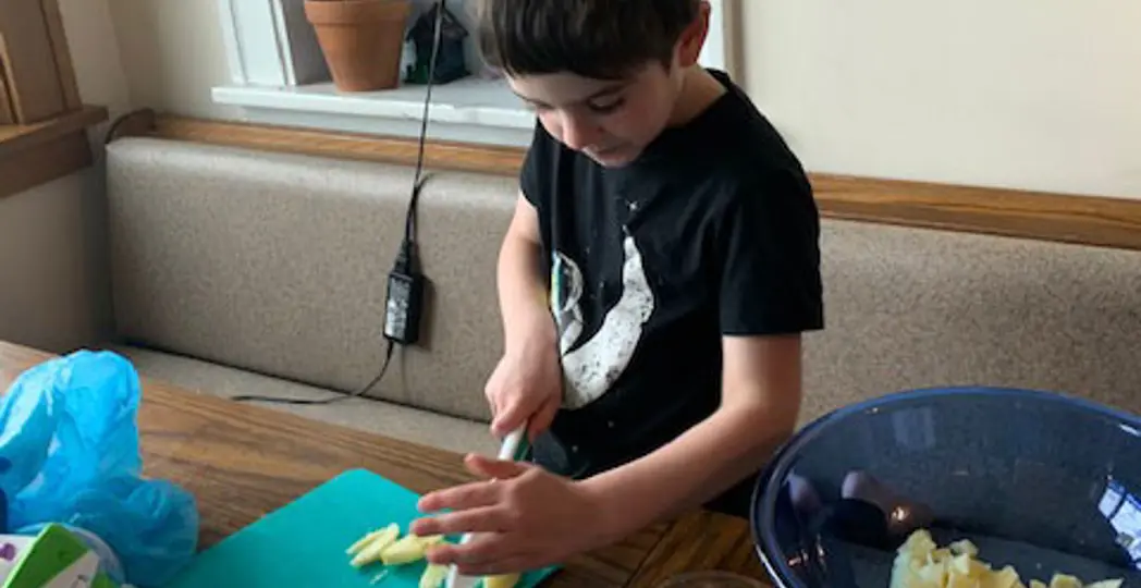 So, we improvised and began with apples. Three of them, Honeycrisps, slightly past their peaks. I peeled them over the sink, and my son sawed at the fruit with his flimsy plastic knife and cutting board. Then, I realized belatedly that we didn’t have any crushed walnuts in the house. So I put handfuls of whole nuts in a blue plastic grocery bags, and let Max bang at the nuts with a hammer, laughing wildly as he did, until they were crushed like dust. Afterwards, we carefully poured a cup of wine, too much sugar and so much cinnamon that it made us cough into the mixture. The result was a chunky conglomeration that my son said looks like applesauce. It was probably just as sweet, too. But perhaps we needed some extra sweetness to counteract this unprecedented time, I told my husband. Anyway, he didn’t seem to mind.
