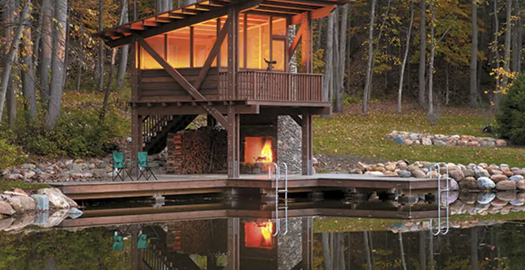Tucked away on a 22-acre wooded lot in Hunting Valley, it feels like a private summer camp. The two-story, open timber pavilion and wooden dock, designed by Peninsula Architects, make a perfect space to roast marshmallows, rest on the screened balcony to birdwatch or soak in the stars. “It really connects to the landscape,” says Peninsula principal Joseph Matava. An intricate series of walled gardens, a barn, infinity pool and bathhouse provide other ways for homeowner Allen Denzine, president of Cortest Inc., and his family to commune with their surroundings. “They’re always outside gardening and planting,” Matava says. Even in the winter, they enjoy ice skating across the frozen 1.5-acre pond to warm up by an open fire. “It’s a serene piece of property,” he says. “They use it year-round.”