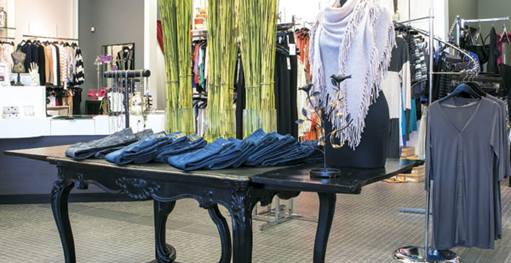 Here, there are no designated junior's and women's sections. In one corner rests a gray door, where NikiBiki camisoles ($12) hang delicately from mismatched knobs. In another, pieces from Twelfth Street by Cynthia Vincent's bohemian collection hang along a sturdy wall rack. The store's distressed furniture and funky finds appeal to a young, Pinterest-loving crowd while its luxury items, such as a structured navy Ramy Brook Markie dress ($395), charm older shoppers.