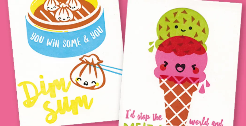 We can’t help but smile when we receive a greeting card with a smiling sushi saying, “Let’s roll” or a frowning corn-on-the-cob with the phrase, “Aw shucks, that really sucks.” Those little moments of delight come courtesy Jess Bennett, the designer behind Letterpress Jess.