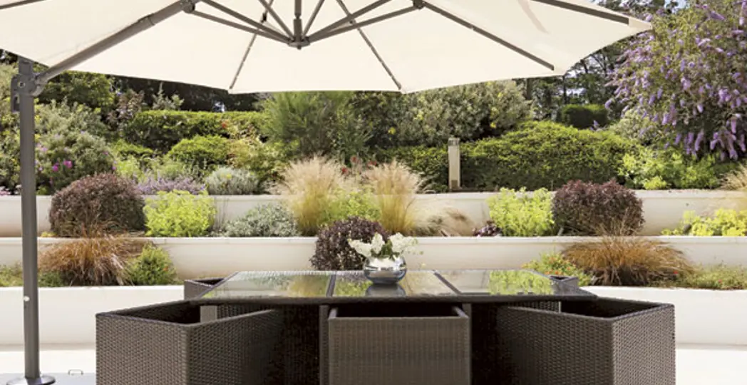 Gather Round: “I love umbrellas because they give you a ceiling in an otherwise open space. Even if its nighttime and you don’t need an umbrella for shade or cover, it gives you that kind of coziness,” Berry admits. She recommends a neutral color, such as white or cream.