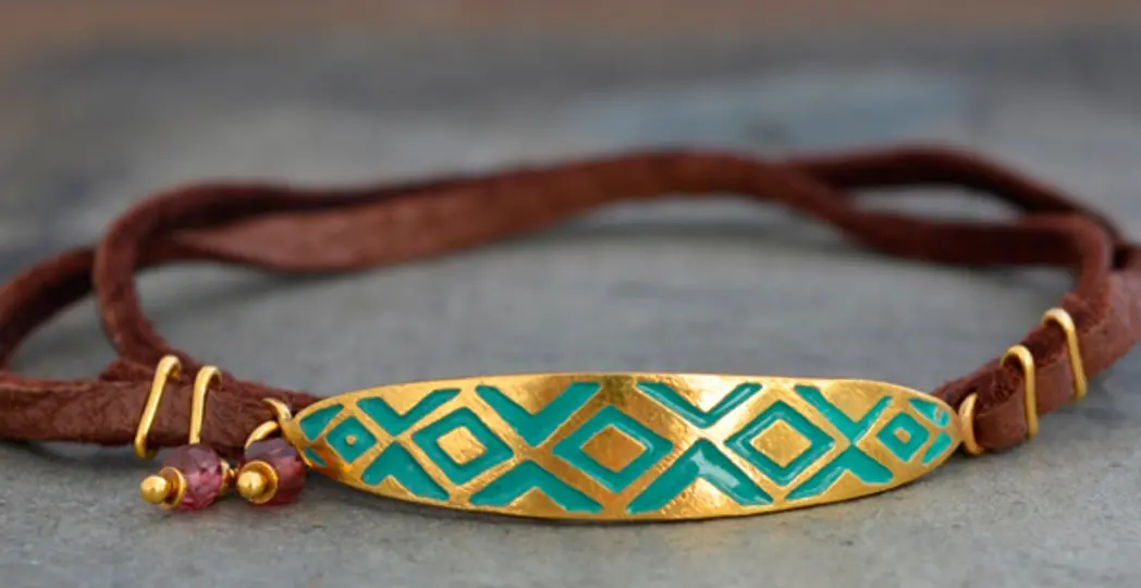 If Sarah Krisher Studio’s Oval Abstract Triangle Bracelet ($220) is reminiscent of an ancient piece of jewelry you’ve seen in an art museum, there’s a good reason. Owner Sarah Krisher creates the gilded oval centerpiece in this bracelet utilizing an ancient technique called champleve, where she uses acid on the sterling silver to etch a triangular design. Krisher fills the grooves with colorful vitreous enamel and fires the piece several times at 1,500 degrees Fahrenheit. The bracelet, which is also dipped in 24-karat gold, is totally customizable by adding beads or changing up the enamel color. “There’s a nice marriage of very Old World techniques mixing in with more contemporary designs,” Krisher says. instagram.com/sarahkrisherstudio