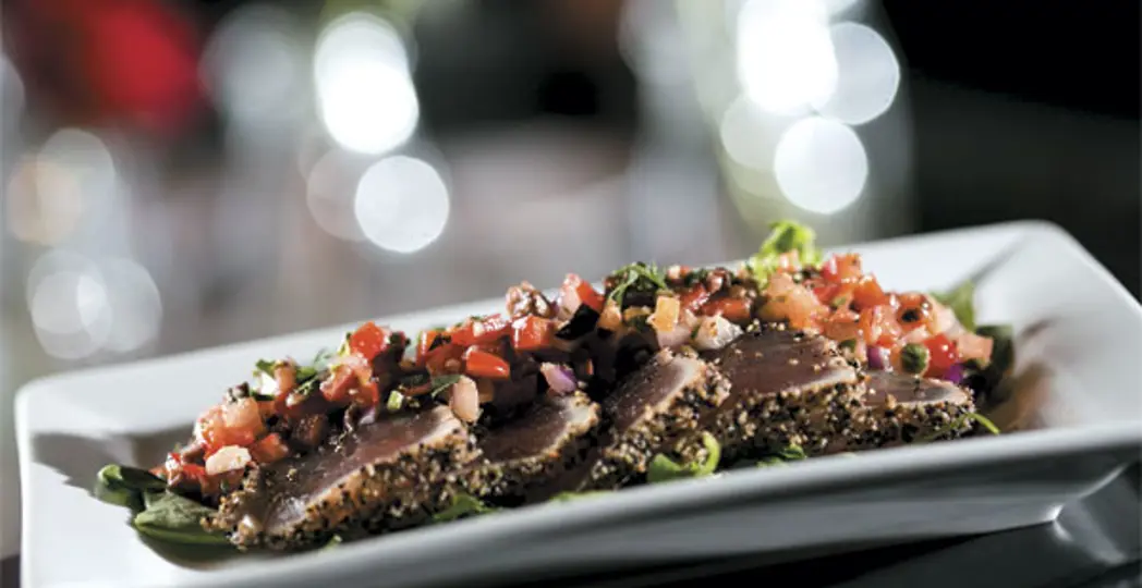 A dish of pepper-crusted tuna ($12) balanced with arugula and a roasted red pepper relish hits spicy, cool and fresh notes all at once. The tuna is deep pink and still moist, obviously sliced just seconds before hitting the table. Shaved Brussels sprouts ($8) tossed with crispy bacon, sharp blue cheese and toasted walnuts are tasty enough to prompt a second order, and a crock of mac and cheese ($9 for half, $16 for full) delivers creamy bites of Gruyere tamed with fresh chives.