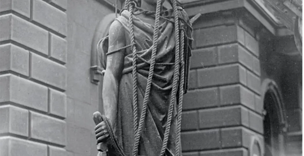 In 1931, wreckers began razing the building as civic favor fell on the Lakeside Avenue courthouse — which now houses the probate court and court of appeals. They toppled the sculpture, removing its left arm and the scales it held. In the process of lowering it to the sidewalk, wrapped in stout ropes, they managed to chip its broad sword.